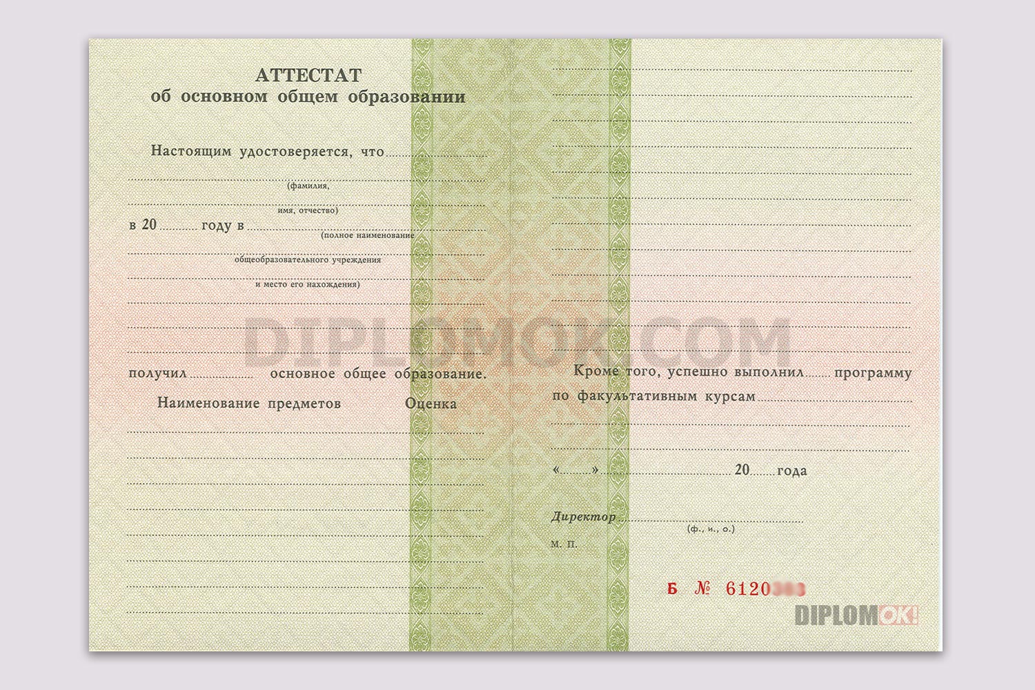Аттестат школы российского образца с окончанием 9 классов в промежуток с 1995 по 2006 года, заполненный в соответствии с государственными стандартами. Заверяется круглой гербовой печатью выбранной школы и подписью её директора.